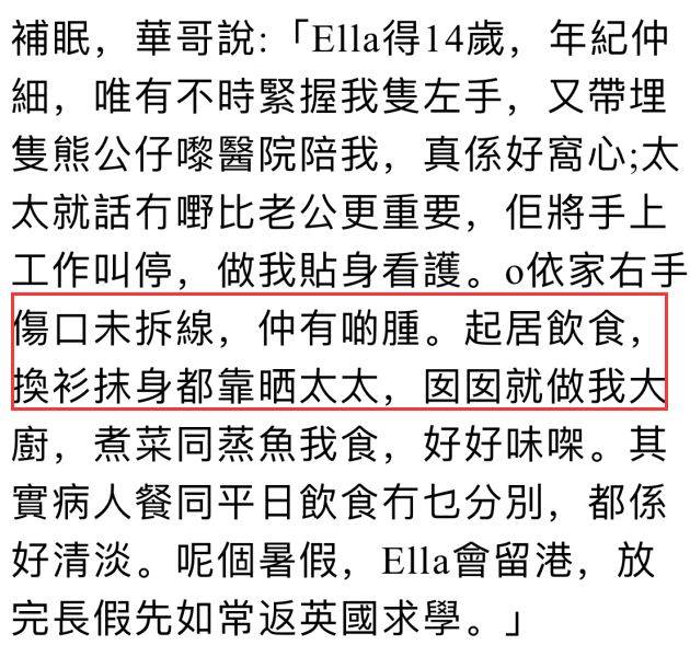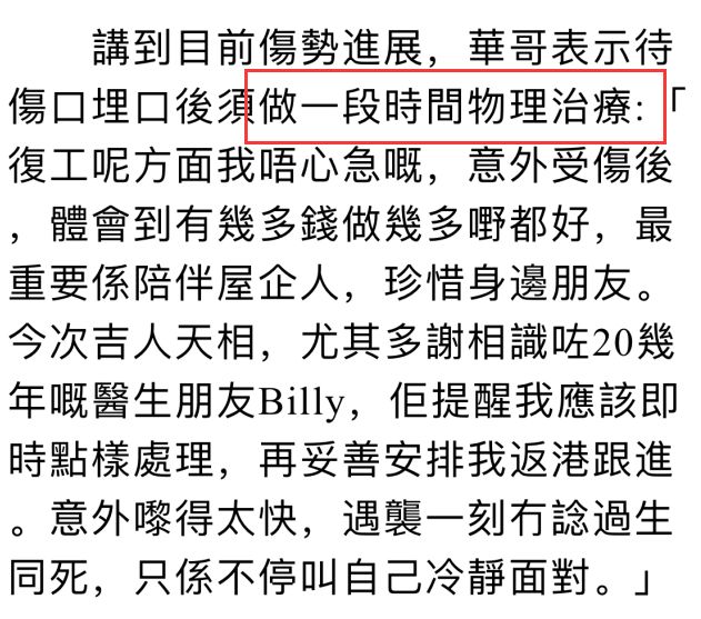 7月31日,任达华电话接受采访的内容被曝光,华哥还透露了自己伤势的最新情况。前不久可以看到华哥的手上缠着厚厚的绷带,这次任达华表示自己的伤口还没有拆线,看上去有点肿,而自己的起居饮食都是由自己太太和女儿照顾。提到自己的家人,华哥也是一脸的幸福。