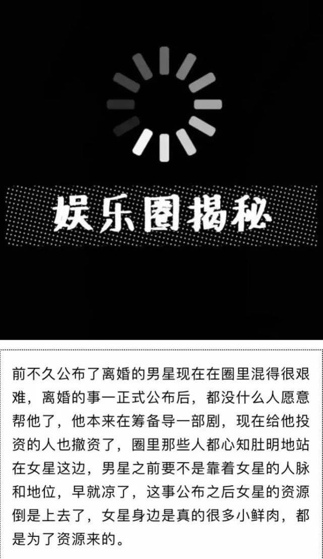 7月31日,一名资深娱记爆料:“前不久公布了离婚的男星现在在圈里混得很艰难,离婚的事一正式公布后,都没什么人愿意帮他了,他本来在筹备导一部剧,现在给他投资的人也撤资了,圈里那些人都心知肚明地站在女星这边,男星之前要不是靠着女星的人脉和地位,早就凉了,这事公布之后女星的资源倒是上去了,女星身边是真的很多小鲜肉,都是为了资源来的。”